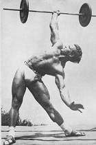 Han trening? Stort sett 3 ganger i uken, hele kroppen hver gang, 3 øvelser pr muskel 9-12 reps. Øktene tok 2-2,5 timer hver gang og ble oftest utført mandag, onsdag og fredag. Grunnleggende trening? Javisst, men i tillegg så er det ikke så mange som har fått med seg ting som på bildet under, hans evne til håndstående eller hans rekord ved å gjøre en frivending FRA KNESTÅENDE på 135 kg. Grunnleggende ja, variasjon absolutt...
