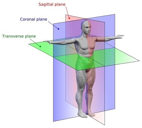 Frontalplanet (her kalt coronalplanet): Øvelser som foregår til siden. Eks: Sidehev med hantler, utfall til siden.