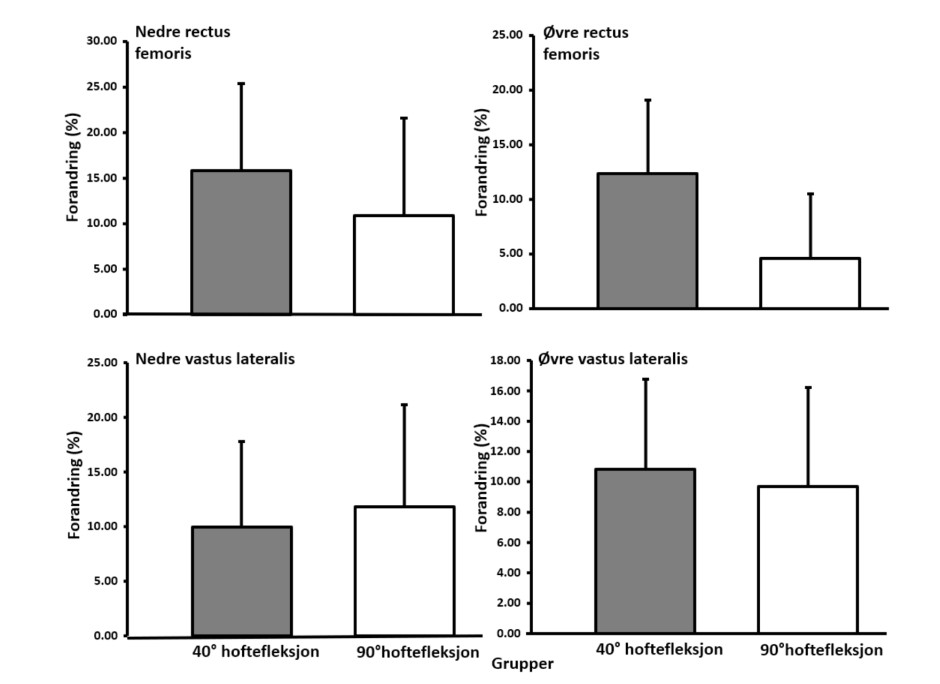 Alle muskler vokste fra pre-test til post-test. Mer spesifikt vokste nedre del av vastus lateralis 9.9% og 11.8% ved 40° og 90° hoftefleksjon. Øvre del av vastus lateralis vokste 10.8% og 9.7% ved 40° og 90° hoftefleksjon. Nedre del av rectus femoris vokste 15.8% og 10.9% ved 40° og 90° hoftefleksjon. Mens øvre del av rectus femoris vokste 12.4% og 4.6% med 40° og 90°.