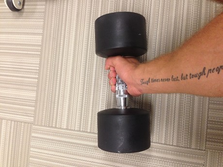 Et normalt grep foregår ved at hånden plasseres på midten av hantelen. En liten grepsjustering er alt som skal til for å gjøre forskjellen. Holder du nemlig hånden din helt ytterst til siden på hantelen slik bildet viser vil biceps aktiveres bedre.
